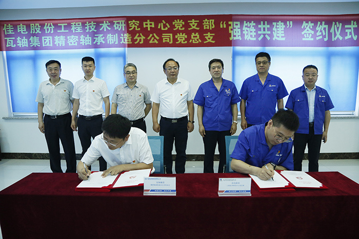 為深入貫徹落實哈電集團“三級書記抓質(zhì)量”工作要求,深入開展“強黨性 精技術(shù) 提質(zhì)量 優(yōu)服務(wù)”主題黨日系列活動,積極向供應(yīng)鏈延伸加大黨建共建力度,以黨建引領(lǐng)促進(jìn)技術(shù)水平和產(chǎn)品質(zhì)量提升,近日,哈電集團佳電股份工程技術(shù)研究中心黨支部與瓦房店軸承集團精密軸承制造分公司黨總支開展以“強鏈共建”為主題的聯(lián)建共建活動。并簽訂黨建共建協(xié)議。佳電股份黨委副書記劉漢成、瓦軸集團黨委副書記孫世成出席簽約儀式。瓦軸集團代表在公司領(lǐng)導(dǎo)陪同下參觀了企業(yè)展廳和生產(chǎn)車間。