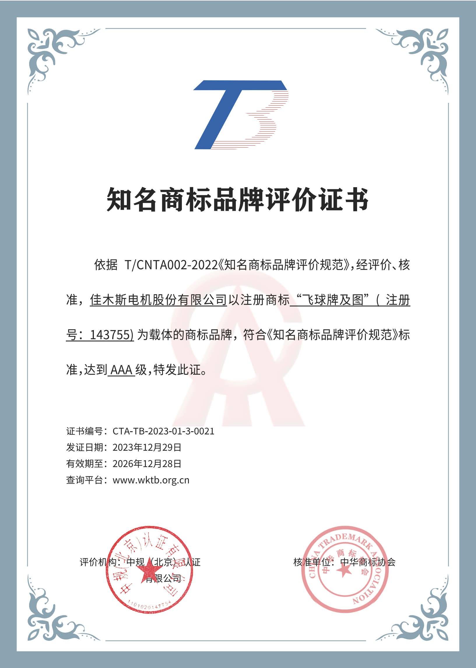 近日,經(jīng)中華商標(biāo)協(xié)會(huì)和中規(guī)(北京)認(rèn)證有限公司AAA級(jí)知名商標(biāo)品牌評(píng)價(jià)審核,哈電集團(tuán)佳木斯電機(jī)股份有限公司(以下簡(jiǎn)稱(chēng)“佳電股份”)“飛球牌”商標(biāo)順利通過(guò)AAA級(jí)(國(guó)家級(jí))知名商標(biāo)品牌認(rèn)證,成為行業(yè)內(nèi)首家獲得此榮譽(yù)的單位。...